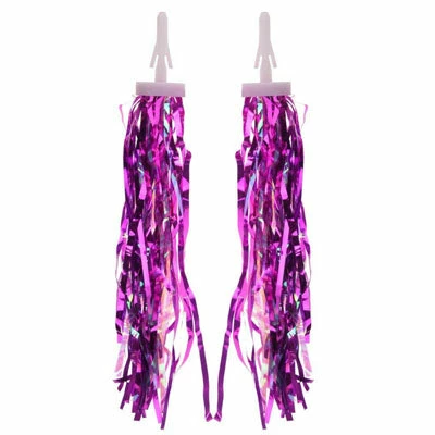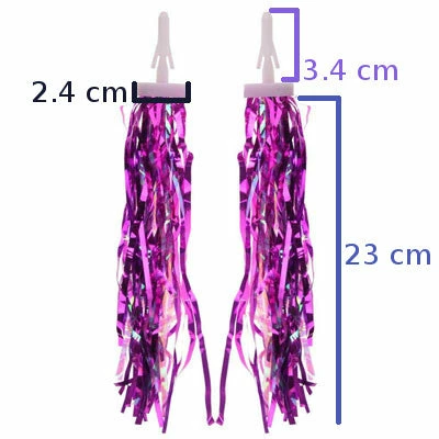 Ces lannières ont une longueur de 23 cm. Elles sont de couleur argent, rose et violet avec un aspect brillant, idéal pour apporter une touche originale à un vélo enfant.