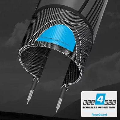 Le pneu Big Apple est équipé de la protection anti-crevaison RaceGuard, d’un niveau élevé de 4 sur 7. Deux couches de Nylon sont entrelacées sous la bande de roulement et offrent une carcasse de 67 TPI. Raceguard est notamment toute indiquée pour les pneus à profil léger, comme le Big Apple qui pèse seulement 370 grammes.